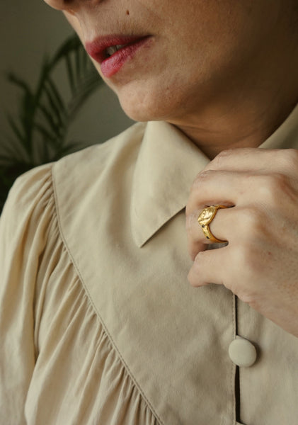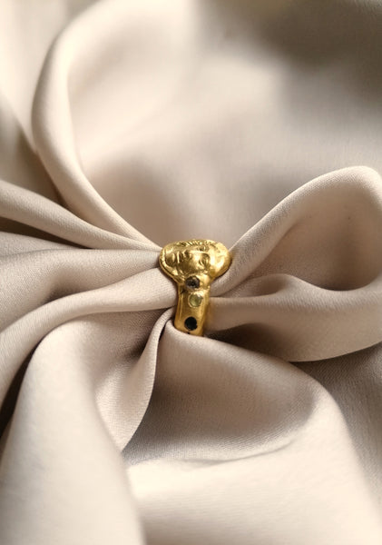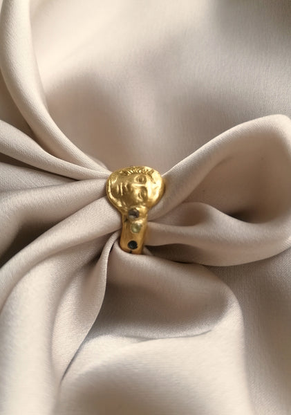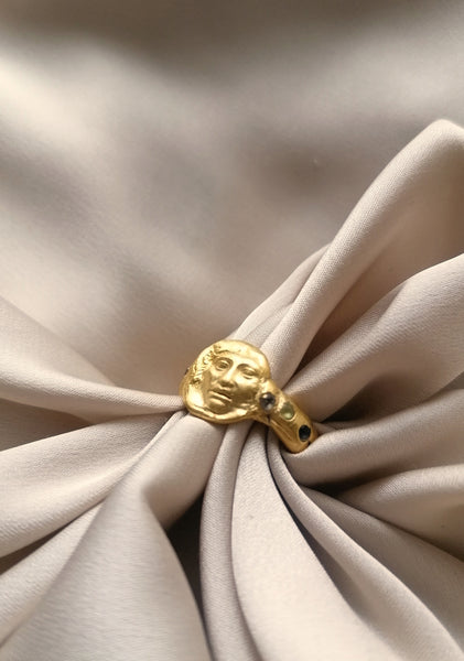 Beautiful ring with the face of Medussa. Hand crafted in high-quality sterling silver and heavy gold plated / vermeil ( 5 micron of 24 carats). Sculpted in wax and transformed in metal, so it's a really unique design. I wanted to create something that it could just had been found in an archaeological excavation. I also added 6 stones, 3 in each side.