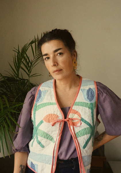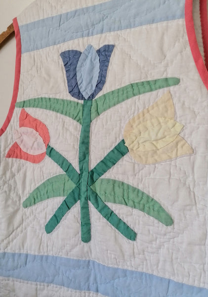 Handmade quilted oversize cotton vest with flowers appliques in various colors and a pink border. You can wear it just with a blouse or t-shirt but you also have room to wear it with a pull over.