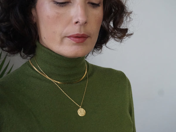 Elegant double necklace with a snake chain and a separate pendant depicting an ancient image of an egyptian relief showing the pharaoh passing to the other life. You can wear them together or seperate.